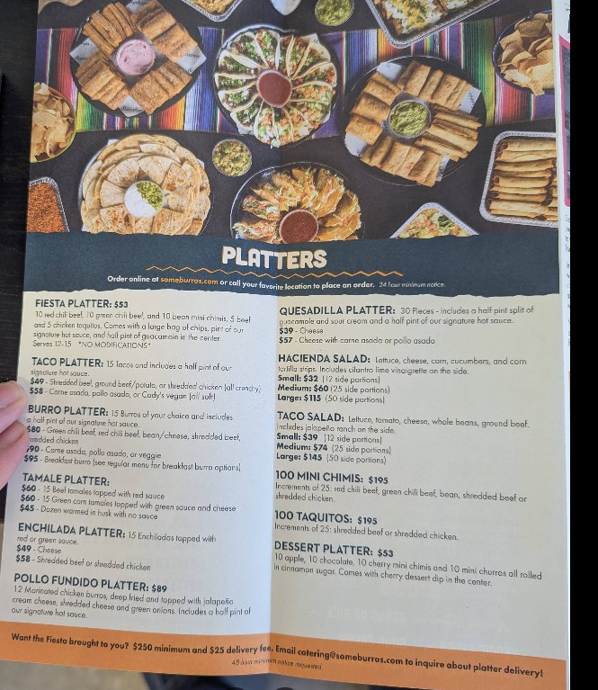 Update April 2025 Not much of a change. Still good. We usually eat at once closer to our house but stopped back at this one in an attempt to avoid rush hour. Good was great. Ordered enough for next overs. Older review. We like Someburros. I'm a creature of habit and usually get the pollo fundido. Wife usually get some sort of combo plate. This time I ordered the Mexican pizza. It's really good too. We will definitely go back.